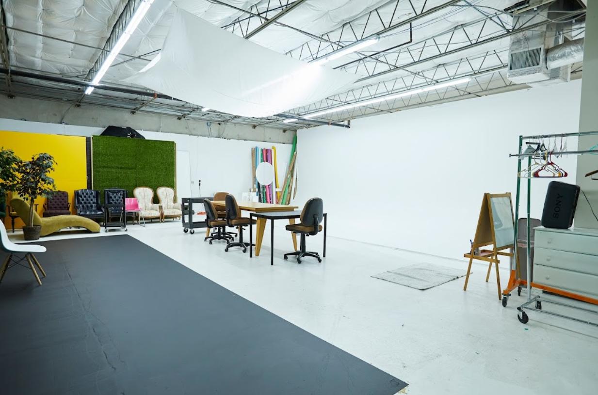 The large sized studio has photography spaces for tabletops headshots and full scale room sets.